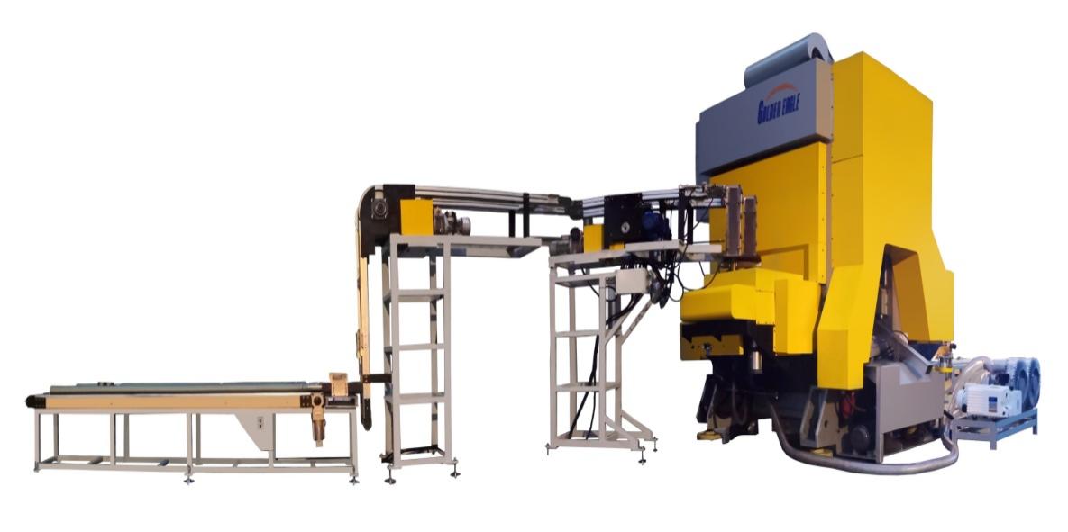 Sheets material preparation platform → Automatic robotic feeder → CNC gantry press → high speed round edge machine → Rotary lining machine → induction drying oven → Temporary put.